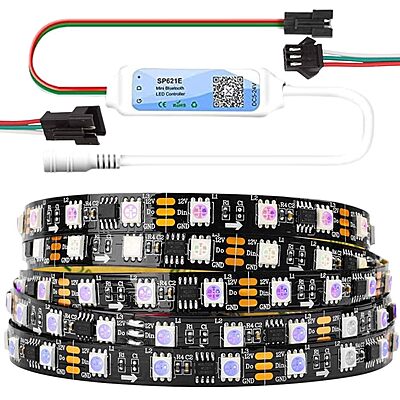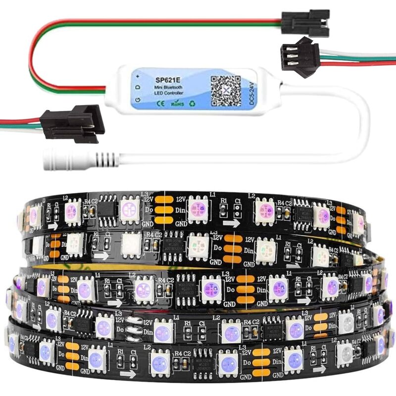 Ws2811 12V RGB Addressable Pixel Led Strip | 60 Led/1M | 5 Meter Roll | Complementary 1 Pair 3 Pin Connector and 12v SP621E 600 LED Controller